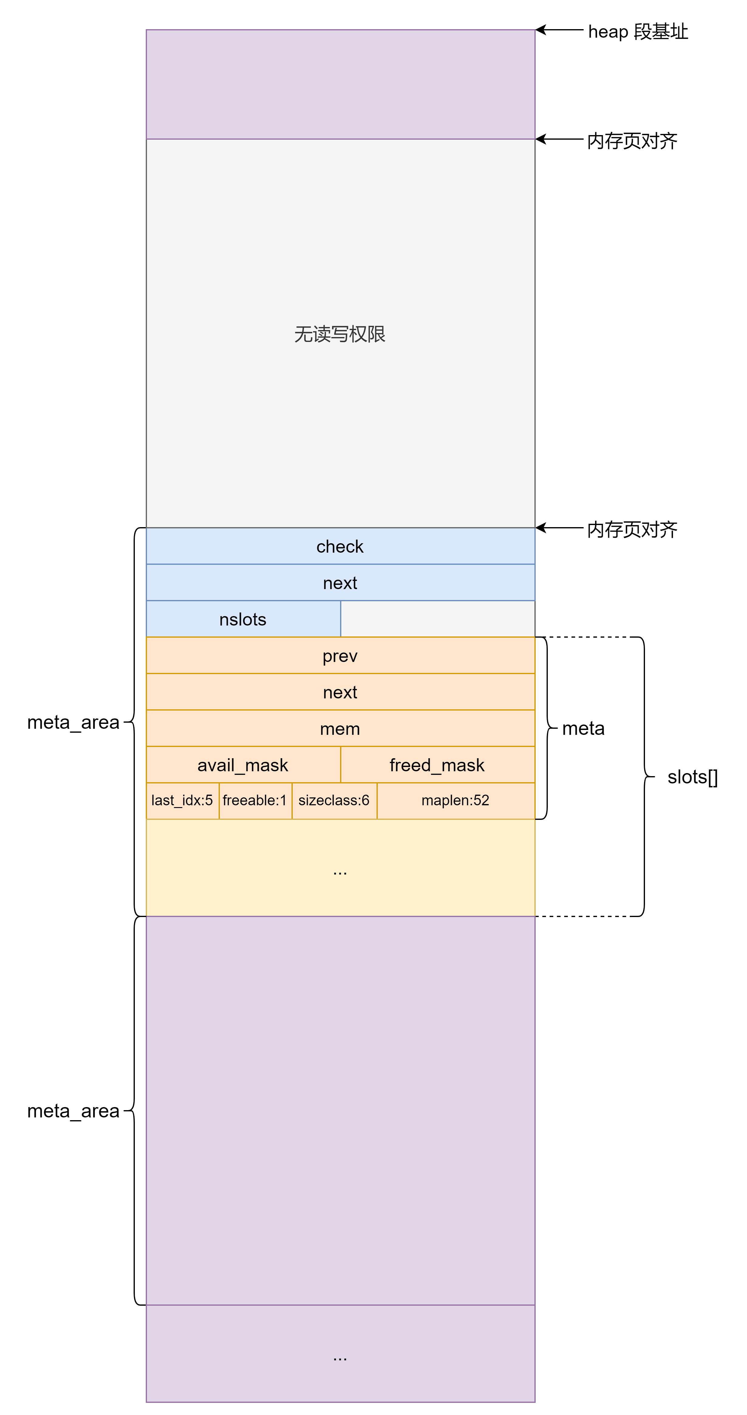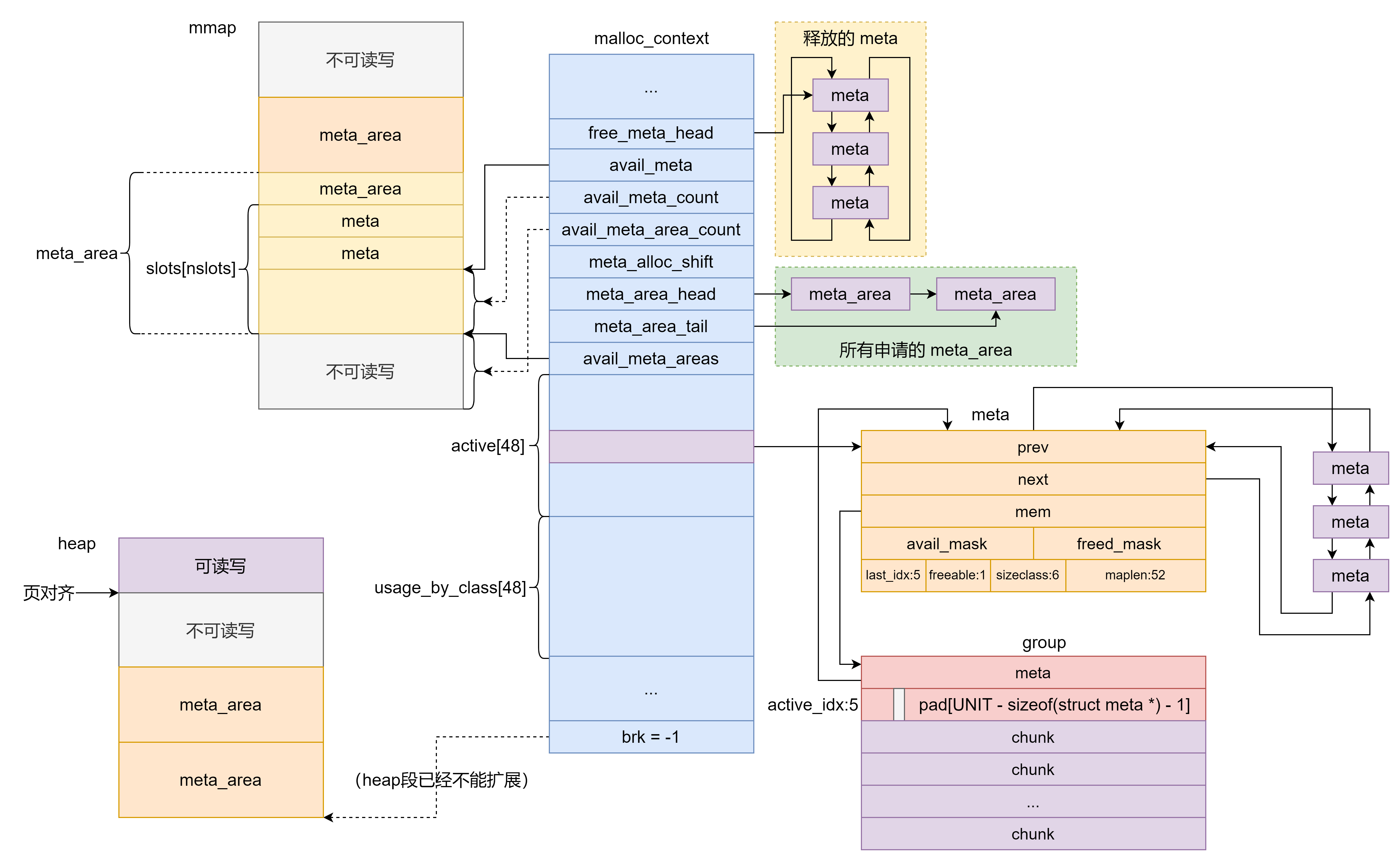 如果加上将要释放的 chunk 该 group 中的所有 chunk 要么被释放要么空闲并且 group 是可以释放的则首先判断 meta 是否在 active 这个 deque 中,如果在的话会将该 meta 从 deque 中取出。如果取出这个操作改变了 active 指针则将 active 当前指向的 meta 对应的 group 中的 chunk 调用 activate_group 函数激活。之后调用 free_group 将 chunk 所在的 group 释放并返回需要 munmap 的内存。