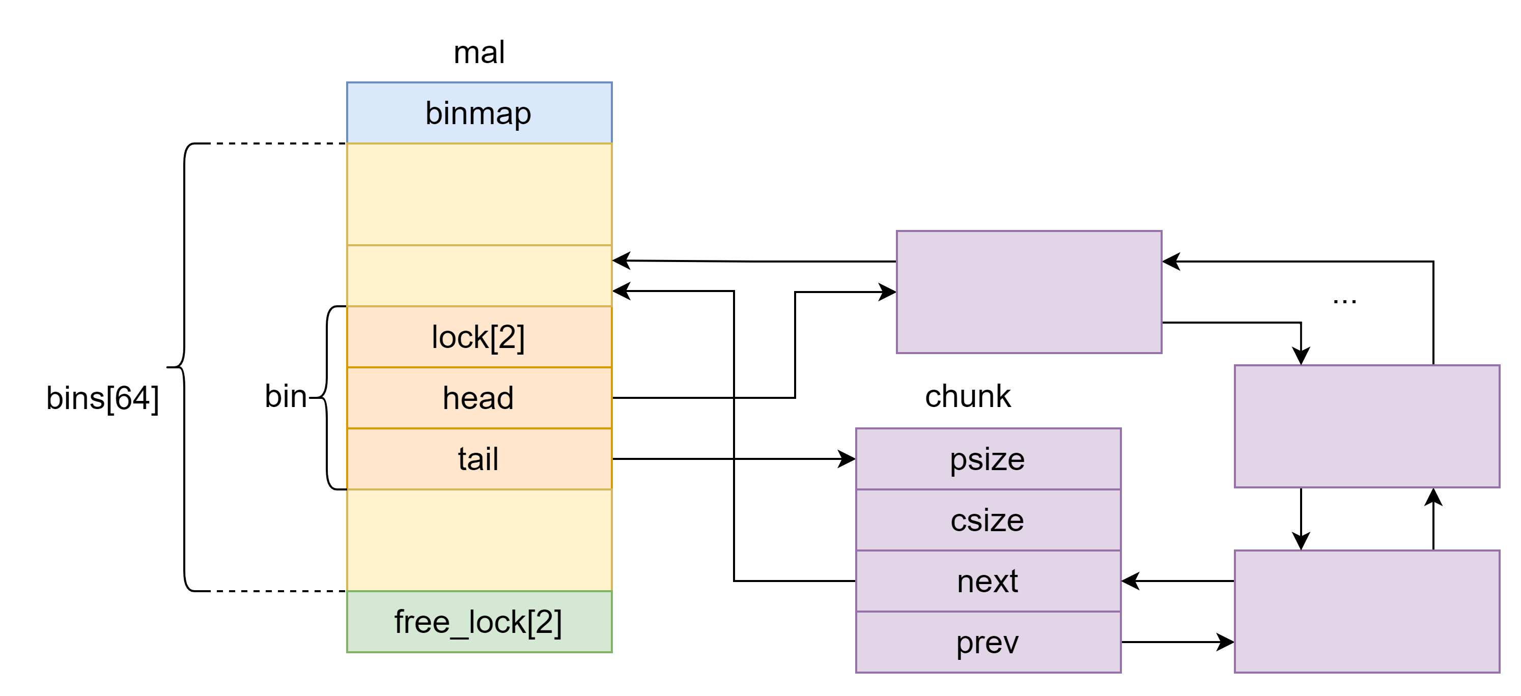 如果大小不超过 MMAP_THRESHOLD 则先通过 bin_index_up 函数计算 chunk 大小对应的 bin 数组下标 i 。然后通过 mal.binmap 获取下标大于等于 i 的非空 bin 。接下来是两种情况,如果没有则调用 expand_heap 函数扩展堆然后调用 alloc_rev 将新扩展的堆块和前面空闲的堆块合并然后跳出循环,否则调用 first_set 函数获取大于等于 i 的最小下标,然后利用 pretrim 或 unbin 将 chunk 从 bin 链表中取出,最终也会跳出循环。这两种情况最终都会调用 trim 函数,这个函数的作用是从 c 上切下一块 chunk 用于内存分配,剩下的释放掉。