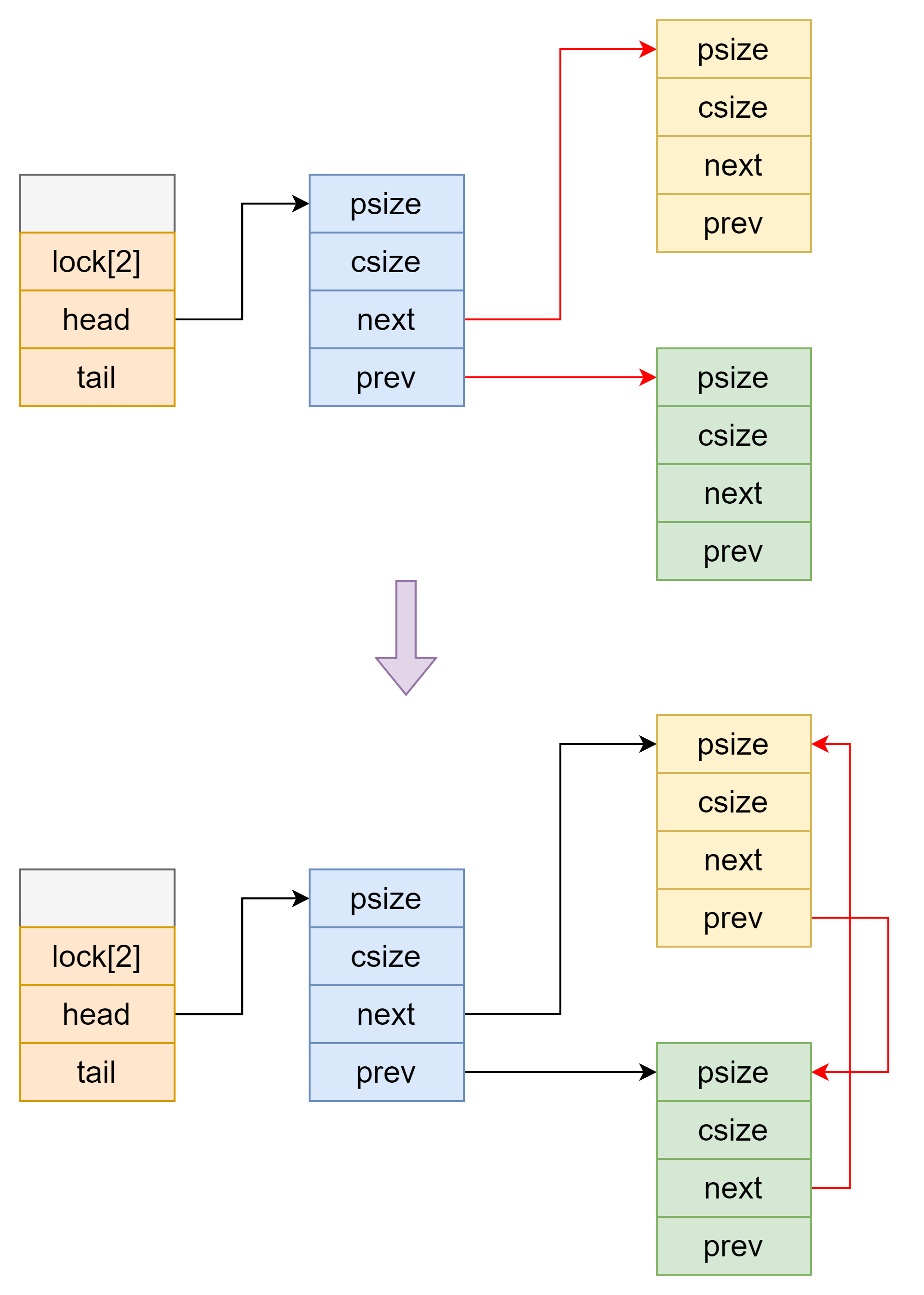 之后设置新扩展的 chunk 和下一个 chunk 的头部信息。
